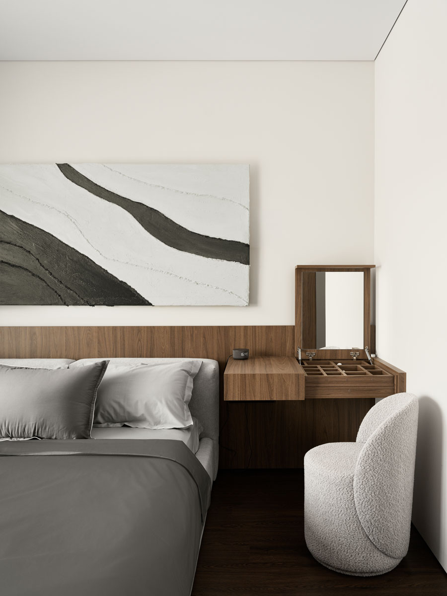 За внешним минимализмом и аккуратными стыками скрывается современная начинка: элементы умного дома, электрокарнизы, тёплый пол.