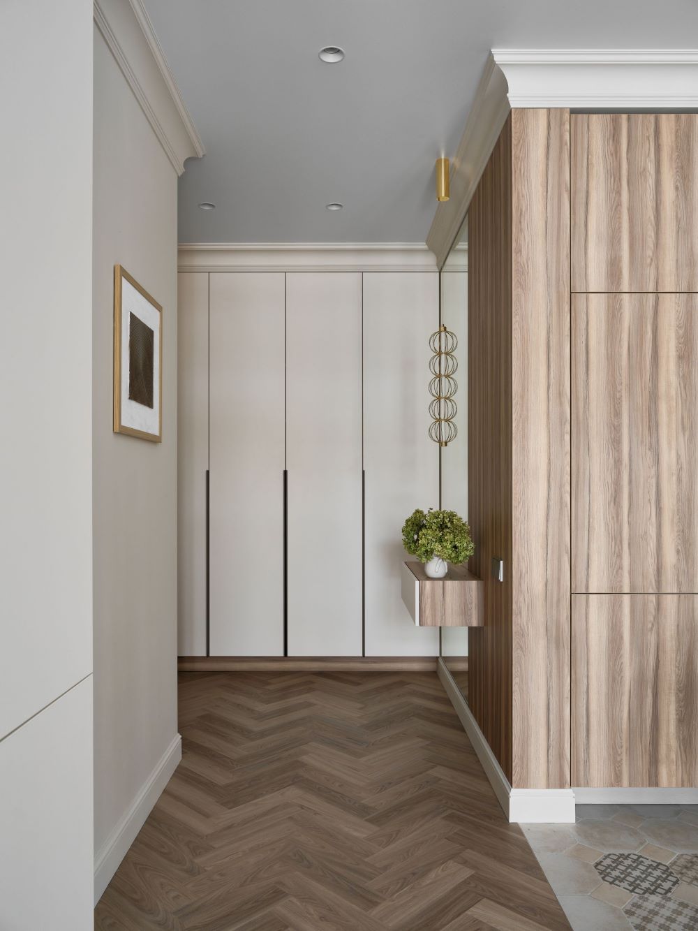 Классика этого интерьера читается в деталях — филёнках на стенах, широких карнизах и спокойной симметрии. Пространство звучит современно и легко, как продуманная композиция без лишних нот. Акцентная стена в цвете хаки добавляет интерьеру глубину и гармонично объединяется с тёплым деревом в отделке.